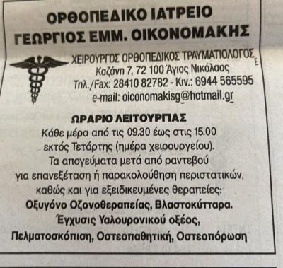 ΟΙΚΟΝΟΜΑΚΗΣ ΓΕΩΡΓΙΟΣ - ΟΡΘΟΠΕΔΙΚΟΙ ΑΓΙΟΣ ΝΙΚΟΛΑΟΣ ΛΑΣΙΘΙΟΥ - ΤΡΑΥΜΑΤΙΟΛΟΓΟΙ ΑΓΙΟΣ ΝΙΚΟΛΑΟΣ ΛΑΣΙΘΙΟΥ